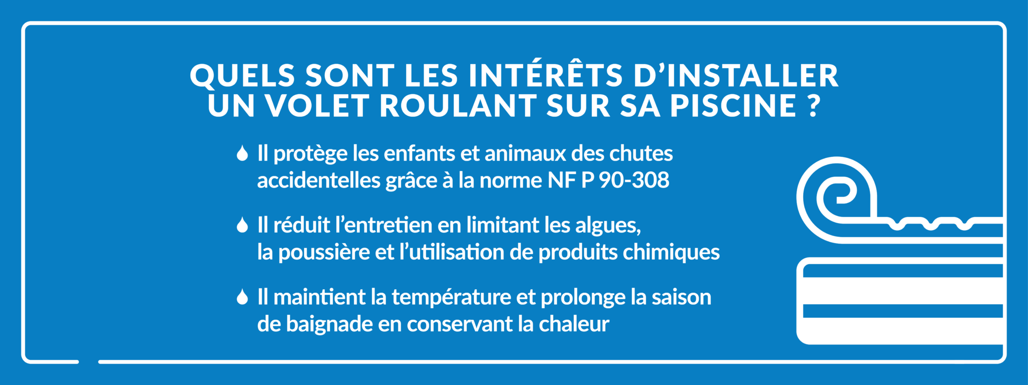 Sur le plan de la sécurité, le volet roulant est un dispositif homologué conforme à la norme NF P 90-308. Il empêche la chute accidentelle des enfants de moins de 5 ans dans le bassin et peut remplacer légalement une barrière de sécurité, une alarme ou une couverture de piscine.