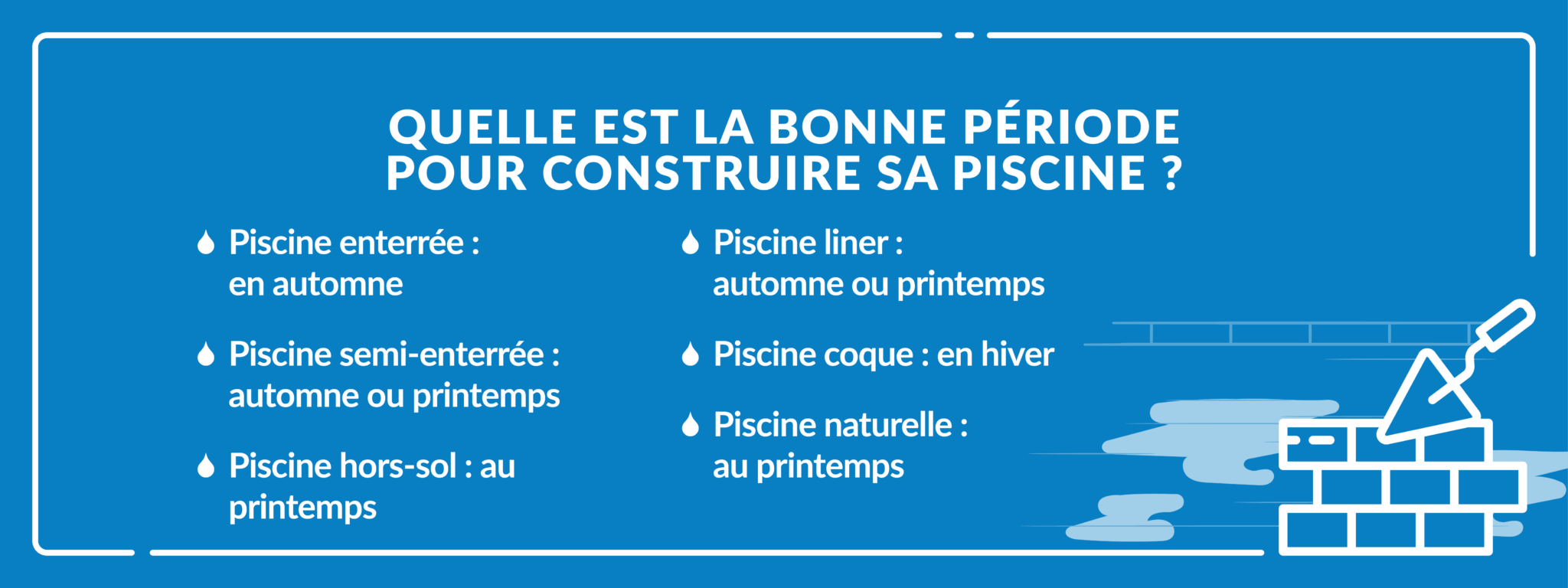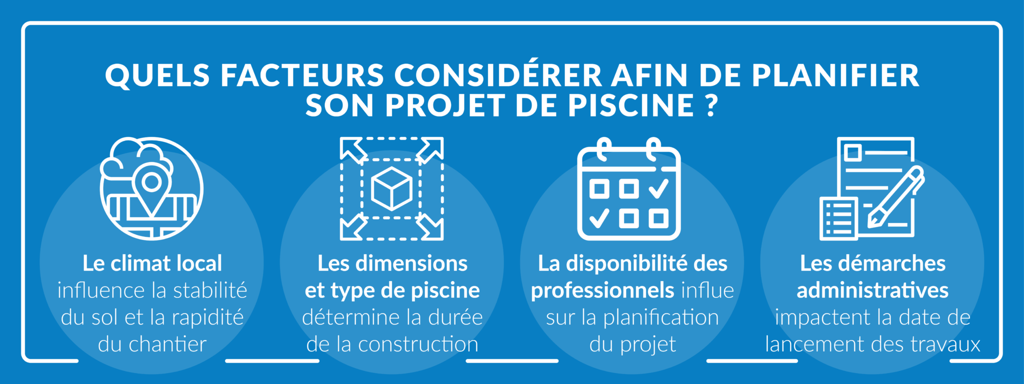 Les démarches administratives prenant du temps : commencez donc la planification plusieurs mois à l’avance. La meilleure période pour faire construire sa piscine étant l’automne et l’hiver, votre bassin sera ainsi prêt pour le printemps.